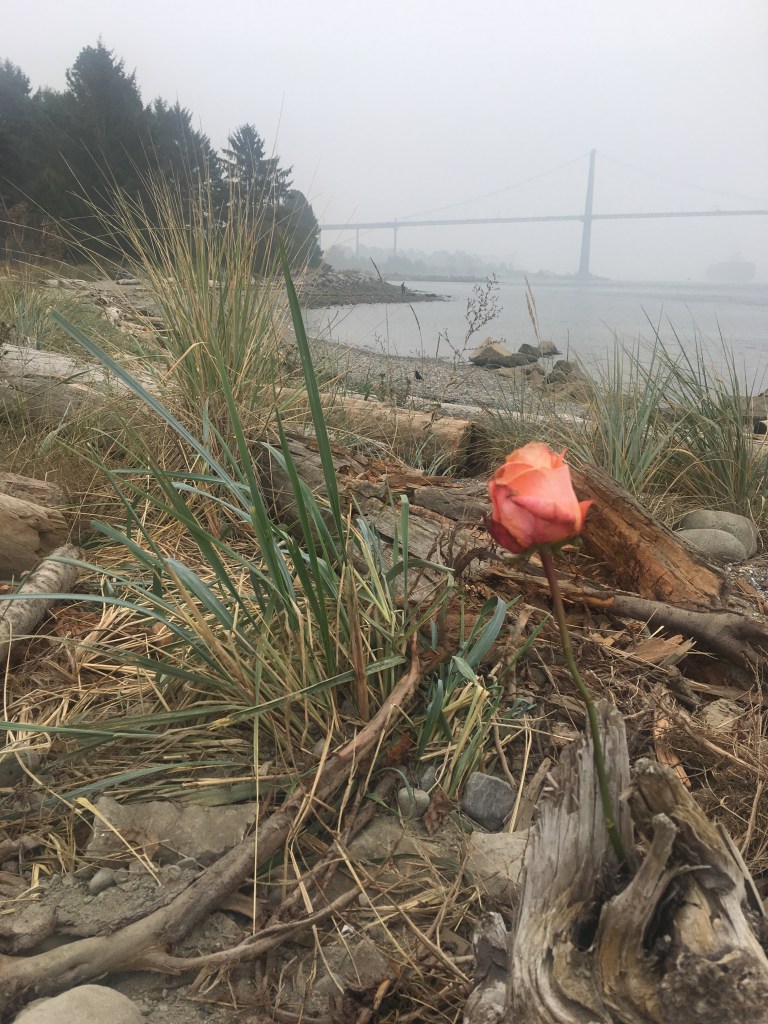 This is BC in 2020 and Lions Gate Bridge on a mid-September day, behind the rose on the beach that someone left behind.