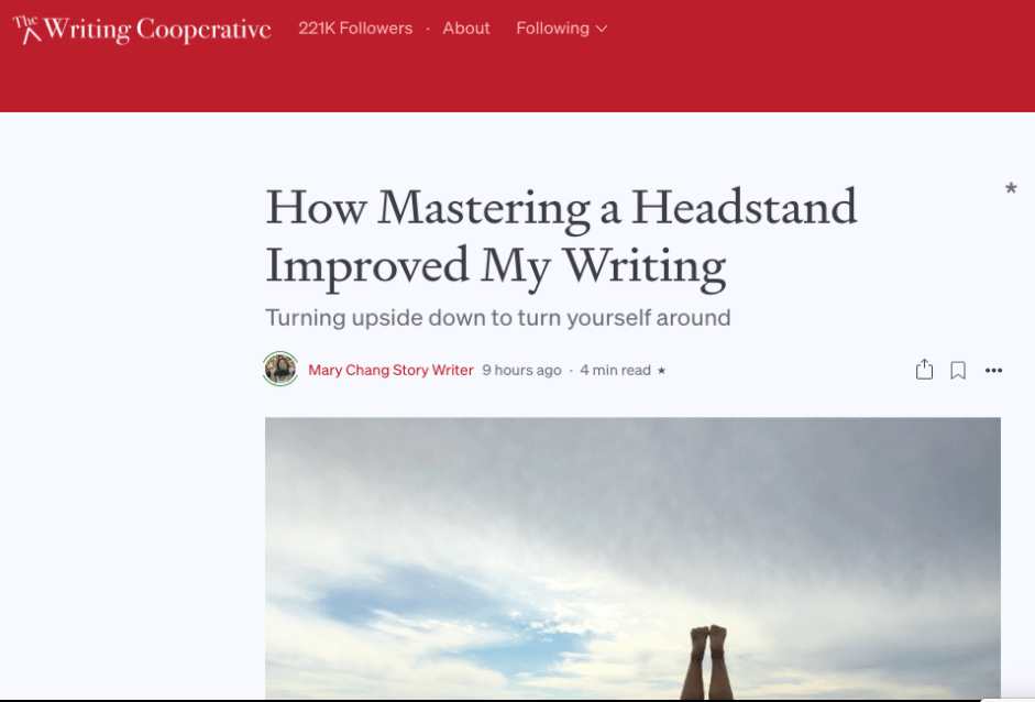 I’m thrilled to be a new writer with the The Writing Cooperative on Medium. I felt it was the greatest publication for sharing my story and inspiring other writers to try the headstand.