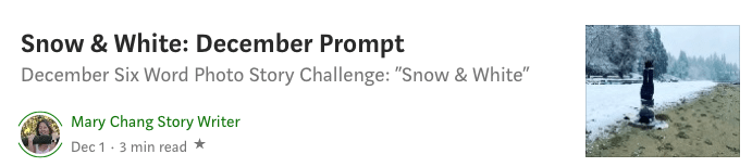 I started my own publication on Medium in September, called “Six Word Photo Story Publication.” The concept is “Can you tell a story in six words inspired by a photo taken by yourself?” Each month features a new writing prompt that challenges writers to take photos or dig into their photo archives to match the prompt.
