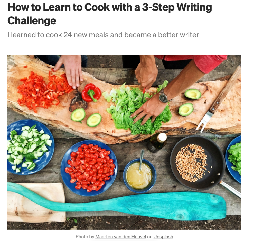 Published in Better Humans. https://betterhumans.pub/how-to-learn-to-cook-with-a-3-step-writing-challenge-cb44a5c6cc07?sk=207b0be7949a25b96c514d19f3ed833c